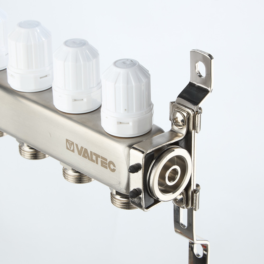Выходы обратного коллектора блока VTс.579 оборудованы регулирующими клапанами с возможностью установки электротермических сервоприводов, подающего – настроечными клапанами с расходомерами (ротаметрами). В комплект входит пара сдвоенных кронштейнов с двумя комплектами хомутов.